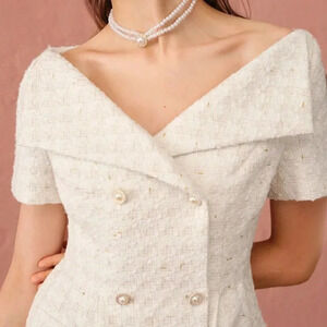 White Elegant Women's Autumn Romantic Apricot Exquisite Pearl Buttons Dress