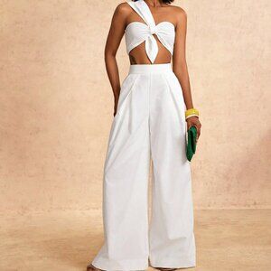 White Elegant Women's Beach Vacation One-Shoulder Chest Knotted crop top & pants