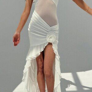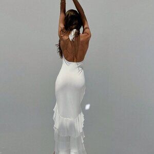 White Elegant Women's Deep V-Neck Halter Backless 3D Floral Ruffle Hem Dress