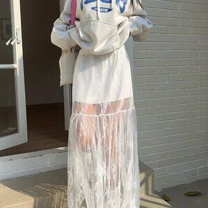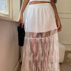 White Elegant Women's Elastic Waist Lace Patchwork Maxi A-Line Skirt