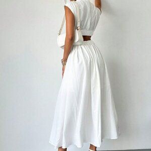 White Elegant Women's Hollow Pocket Cinched Waist Casual Midi Dress