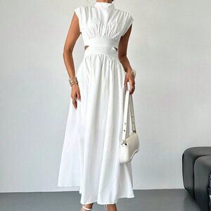 White Elegant Women's Hollow Pocket Cinched Waist Casual Midi Dress