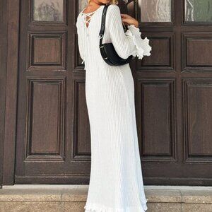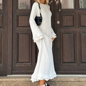 White Elegant Women's Long Sleeve Crew Neck Flare Cuff Sweater Dress