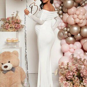 White Elegant Women's Maternity Off Shoulder Foldover Front Floor Length Dress
