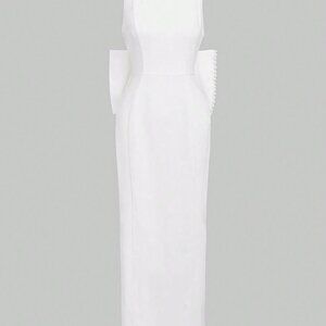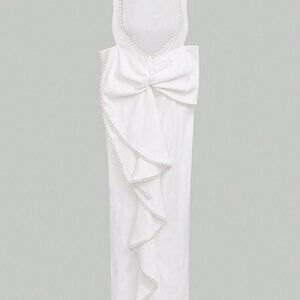A white, long, slim-fit dress with a boat neck, sleeveless tank silhouette and backless design, accented by a pearl bow. Ideal for holiday dates, prom or elegant parties.