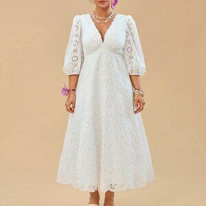 White Elegant Women's Plus Size Holiday Embroidered V-Neck Puff Sleeve Dress
