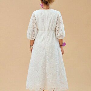 White Elegant Women's Plus Size Holiday Embroidered V-Neck Puff Sleeve Dress