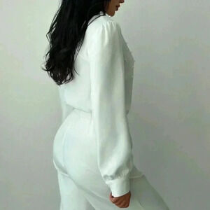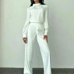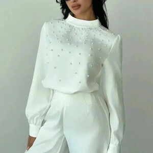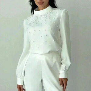 White Elegant Women's Romantic Pearl detailed Ruched Long Sleeve Blouse