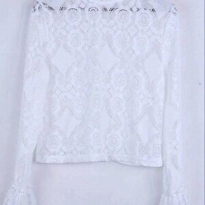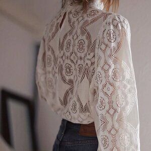 White Elegant Women's Spring And Summer Stand Collar Long Sleeve Hollow Top