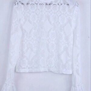 White Elegant Women's Stand Collar Patchwork Lace Long Sleeve Hollow Out Blouse