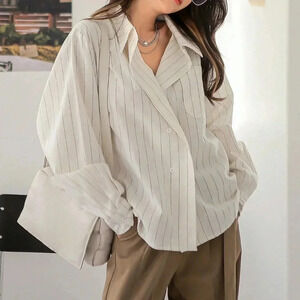 White Elegant Women's Striped Print Drop Shoulder Shirt
