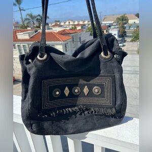 White Elephant Florence Italy linen canvas black fringe beaded tote aztec hippie