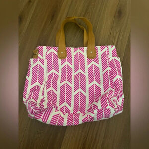 The bag features a trendy striped pattern in pink and white, with a zip closure and brown handles/straps. It is made of high-quality canvas fabric that is water-resistant, making it perfect for outdoor activities or travel. The interior lining is also white, providing a clean and elegant look. This tote bag is part of the White Elm Arrows collection and is sure to impress any fashion-savvy woman.