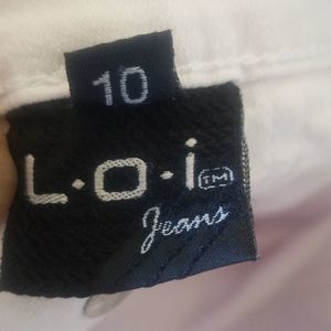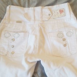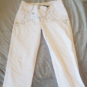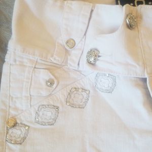 White denim embellished with rhinestones and silver embroidery.. Cute.. good condition.