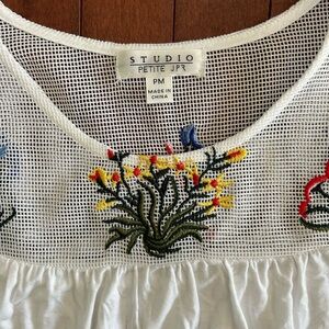 Chic white with vibrant floral embroidery on a mesh background. Features flowy ruffled sleeves for added elegance. Excellent condition! Smoke and pet free home.