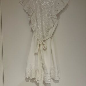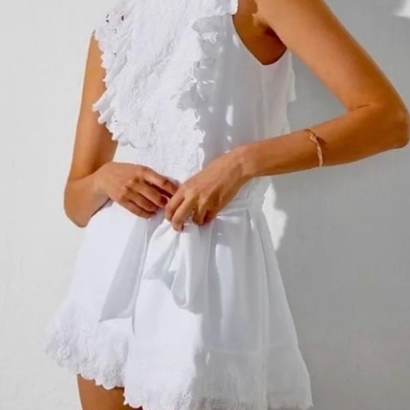 Elegant white romper with lace ruffle details. Perfect for summer occasions, bridal events, bachelorette party, etc.