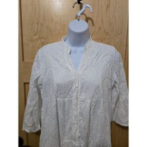 White Embroidered Eyelet Button-Front Midi Dress 3/4 Sleeves Mandarin Collar
