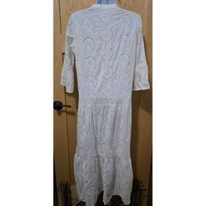 This elegant white midi dress showcases delicate embroidered eyelet patterns, lending a timeless charm. With 3/4 sleeves and a mandarin collar, it exudes sophistication while offering comfort. The button-front detail adds a practical yet stylish touch, ensuring versatility for various occasions. Its lightweight, breathable fabric makes it an excellent choice for warmer days.