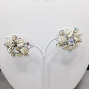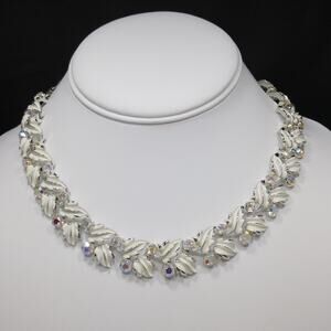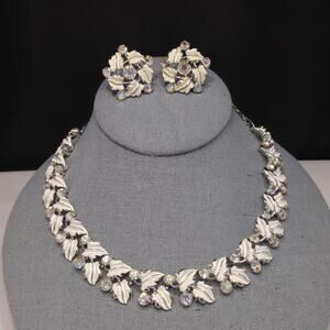 *Description: This is a beautiful mid-century necklace and earring set with white enamel leaves and aurora borealis rhinestones set on a rhodium plated background from the late 1950s. This is a gorgeous set. This would be a great addition to your vintage jewelry collection or make a great vintage gift!