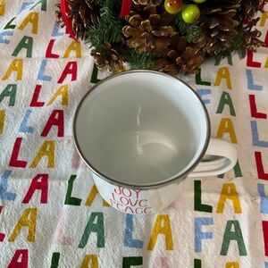 New white enamel Christmas/Winter mug, silver rim, white enamel inside, red lettering Joy Love Peace. Great for coffee or hot chocolate. Makes a great gift! 11 oz.