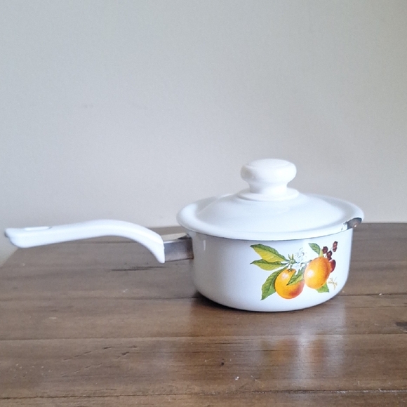 Little enamel sauce pan with a lid, a little over 2 cup capacity, 5" in diameter