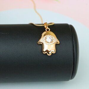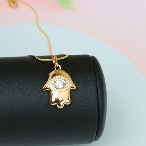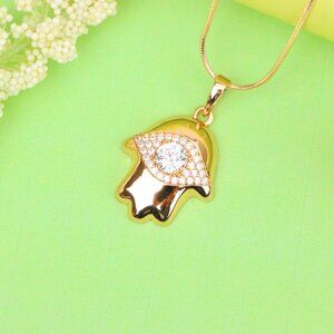 Graceful Hamsa pendant featuring a brilliant white evil eye centerpiece. Designed with care in gold-plated high quality brass for lasting beauty and protection.
