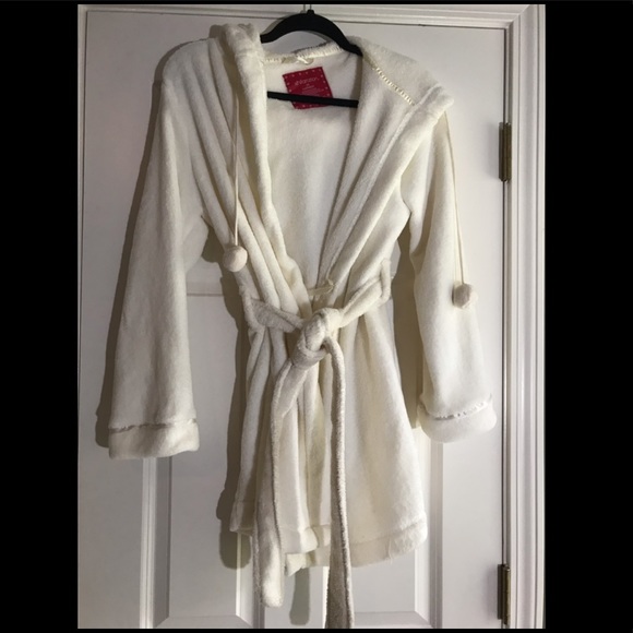 Very soft comfy white robe with belt, hood, draw strings with balls. Xhilaration brand. Size XS