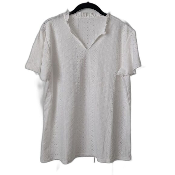 White Eyelet Embroidery V-Neck Top Women’s Medium Ruffle Short Sleeve