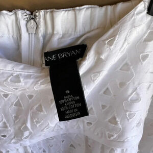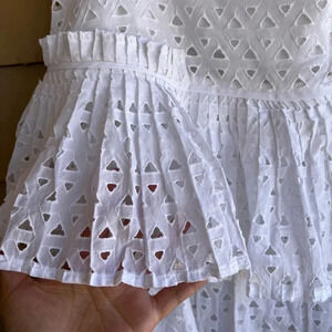 Fully lined. Beautiful eyelet detail throughout the whole skirt. Has a cute ruffle on the left side of the front. Have a zipper in the back and a butterfly clasp. The back has elastic for extra stretch.