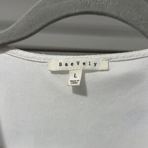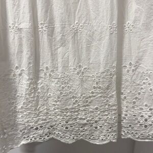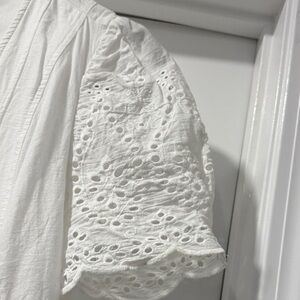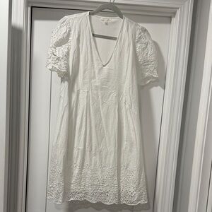 Elegant white mini dress with eyelet details. Features a V-neck and short sleeves. Perfect for casual outings.