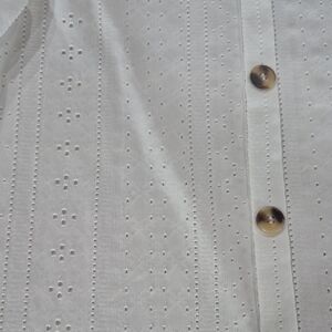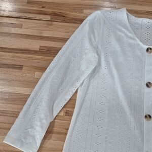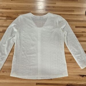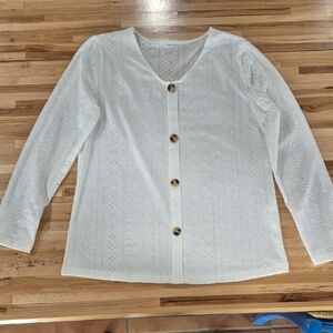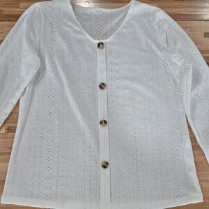 Chic white eyelet blouse with feaux button-up front. Perfect for casual or dressy occasions. White or ivory layering piece.