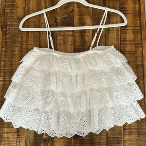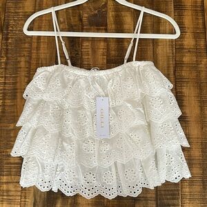 Elevate your style with this elegant white eyelet ruffle top. Perfect for any occasion, this top offers a chic and feminine look.