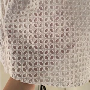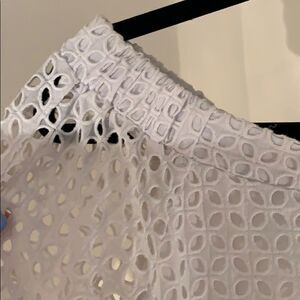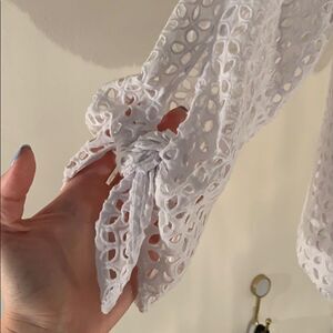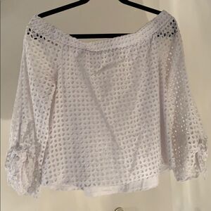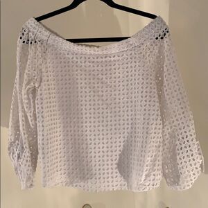 Beautiful white crocheted eyelet pattern top with sheer 3/4 sleeves that tie into a knot at the ends. The body of the top has a white layer underneath and is only semi sheer. Comfortable elastic off the shoulder top. Great condition!