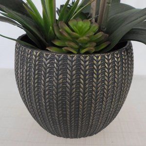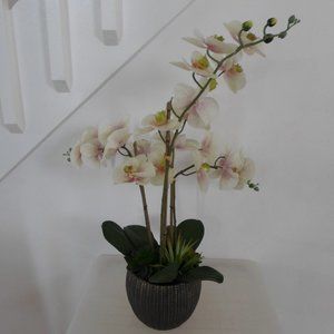 Beautiful floral arrangement features white fabric orchids with green plants on the bottom in a copper, strong, resin planter. Condition is ‘Like-new’. Arrangement size is 26” high & 23” wide. Vase size: height: 5 ¾”.