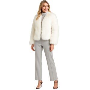 This stylish cropped faux fur jacket adds a touch of sophistication and warmth to your wardrobe, ideal for cooler weather and elegant occasions. Faux fur jacket, cropped jacket, white jacket, medium jacket, snow white, polyester jacket, women's coat, winter faux fur jacket, cropped coat, white, ivory, snow white, plush texture, soft fluffy fabric, snowbunny, sophisticated, voluminous silhouette, cozy luxurious feel, relaxed fit, chic winter outerwear, fairycore, whimsical, holiday party, date night, cocktail event, cold weather fashion, timeless statement piece, elegant, stylish, trendy, sophisticated, glamorous, dressy jacket, soft fur coat, elegant coat, lined jacket, warm jacket, chic outerwear,