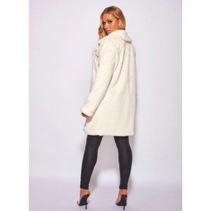 White Faux Fur Long Sleeve Collared Loose Fit Midi Coat
