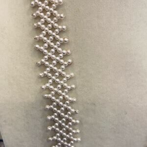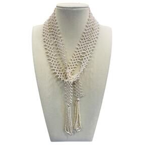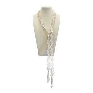 This stunning cream colored necklace features a continuous strand of uniform tiny faux pearls that can be worn in a variety of ways. This lariat style necklace exudes a subtle luster reminiscent of the 1920s flapper era. The piece is elegantly finished with decorative tassels, making it a timeless accessory for any occasion.