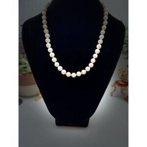 This is a stunning White Faux Pearl Necklace by Peck & Peck, featuring a knotted 18" strand design. The necklace is adorned with round simulated pearls in a classic white color. Good vintage condition.