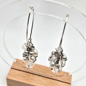 These earrings feature a cluster style design with white faux pearls and faceted clear beads on silvertone French hooks. The earrings are simulated with a round shape and a white color, making them a chic and elegant accessory. Perfect for adding a touch of glamour to any outfit, these beaded earrings are a stylish choice for those looking for a sophisticated look.