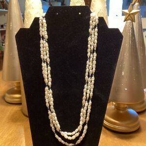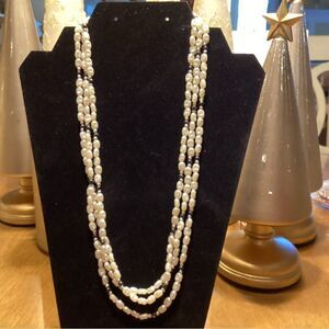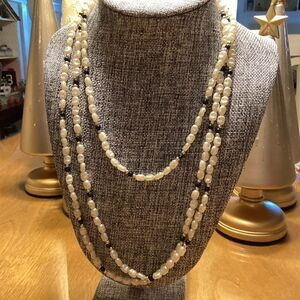 Extra Long 67” strand of faux white rice pearls are perfect for layering. The pearls have tiny goldtone spacer beads with a black accent bead in between. Just great.