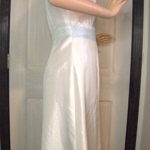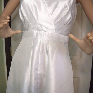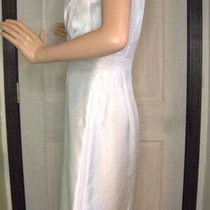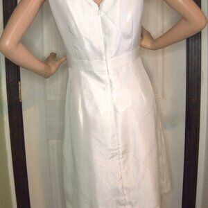 This listing is for a pre-owned dress. This sleeveless knee-length dress features an A-line silhouette, pleated front and V-neckline. It has a hidden zipper at the back and is fully lined. The fabric is woven and is white in color. It has a couple small marks at the waistline and is in good condition. Please carefully view all the posted photos for the exact condition of this dress.
