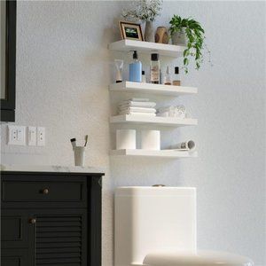 🧿【More Space, More for You】– Black Floating Shelves Size: 16.5"L×5.7"W×1.2"H (SET of 4). Max Weight Capacity: 30 lb. 4 PACK Wall Mounted Black Floating Shelves could give you extra storage in the bathroom, guest bathroom, kitchen, and living room. You can install our small black floating shelves anywhere you like. Let’s make life simpler.