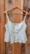 The adorable Lulus Flirtatious Delight White Embroidered Ruffled Bustier Tank Top features lightweight, slightly crinkled woven fabric, darling floral embroidered accents and adjustable spaghetti straps. Slightly scooped neckline tops a flattering bodice with seamed cups and a functional button placket at the front. Sultry silhouette continues with a Basque-inspired, angled waist with ruffled panels at the sides. Interior tag is missing. The bottom button is missing so I tacked it with a needle and thread so it is very easy to remove if you don’t want/like it.