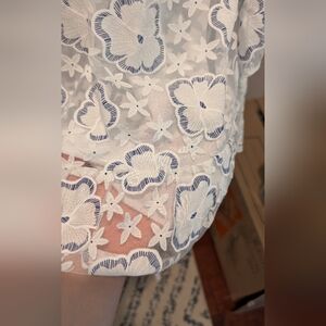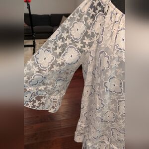 Elegant white lace tunic with floral embroidery Features a flowy design and three-quarter wide flowy sleeves. Can be worn over of off shoulder