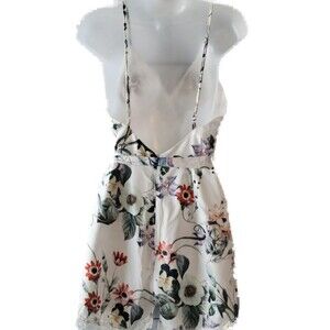 * Description: Adorable floral print, in shades of white, purple, orange, and green, wrap bodice with a waist sash. No tags but looks like Lulus Sprout and About Fully lined. Flirty lace trim. Adjustable skinny straps. Hidden back zipper/clasp.