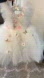 Elegant white tulle dress with floral accents. Features pink and green floral details.