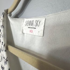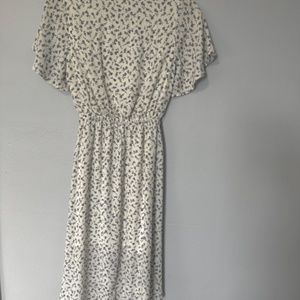 Mid length faux wrap dress with dainty blue floral pattern. Lightweight, silky material. Perfect for bridal shower or any occasion.