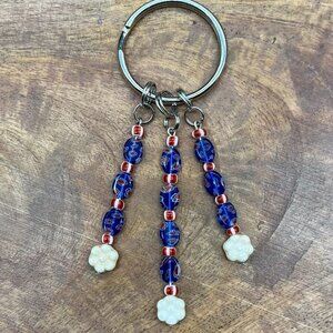 The Flower Keychain has three white glass bead flowers that extend from blue and red designed beads. The beads hang from a 32mm ring giving you plenty of room for keys.