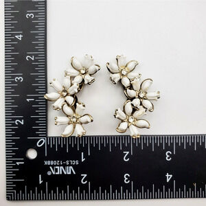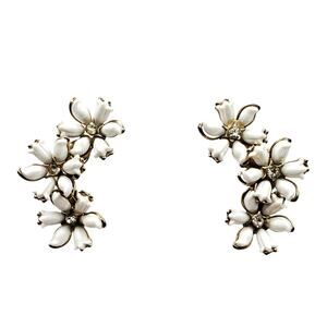 Pretty white floral ear climbers. The clip on earrings have white, acrylic petals surrounding clear rhinestones.