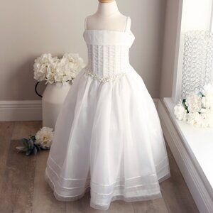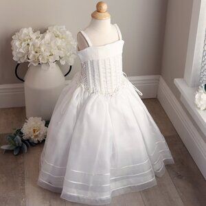 Exquisite best describes this dress that's fit for a Little Princess! The detail is incredible! The bodice has a Corset style done in a Gorgeous Poly White Silk. Corset-style dresses, characterized by boning for shaping & structure, have been prominent in various historical and modern styles. Victorian, Edwardian, Renaissance, and even contemporary wedding gowns often incorporate boning for a structured silhouette. The top has a wide cuff in front and back to add dimension. Half inch shoulder straps keep dress place. Sides of bodice are detailed w/ lace-up satin cords outlined with embroidered trim. A drop waist is detailed with a removable garland w/ trios of white satin roses & ribbon trim, center rose having a rhinestone center. Each side of the trio, is floral details done in white satin cording w/ pearl centers. Front of bodice is adorned with vertical rows of white Soutache trim. Back has a lace-up closure for a perfect fit. Skirt has overlay of White Organza & 3 rows of braided white trim at the bottom. Skirt has two layers of liners, bottom layer having 2 tiers of crinoline for added "Princess" volume. Crinoline ruffles have a white piping finished edge. Perfect for Flower Girls! NWT!